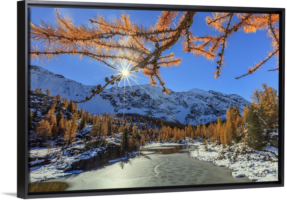 <p>Red larches frame the frozen Lake Mufule, Malenco Valley, Province of Sondrio, Valtellina, Lombardy, Italy</p>