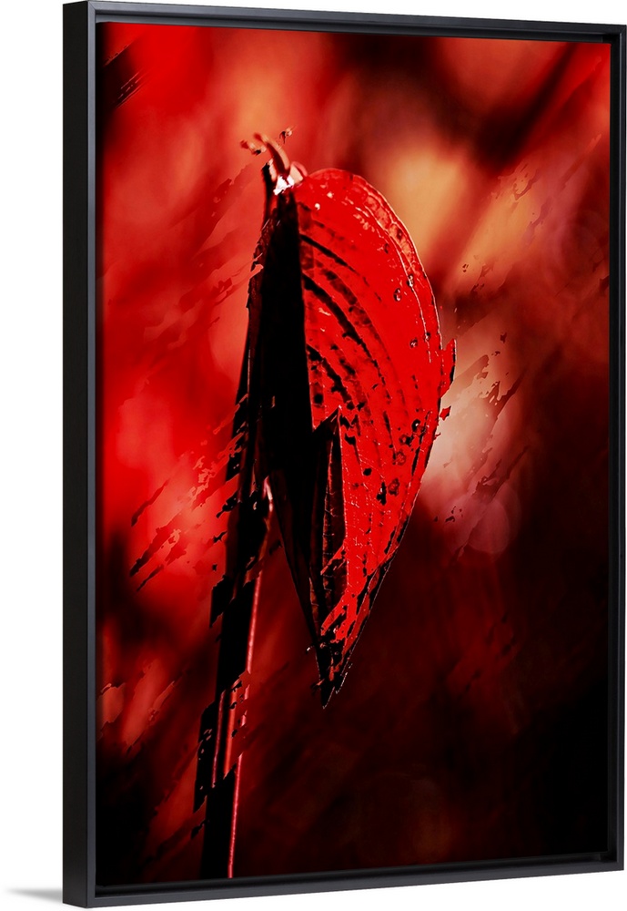 <p>An abstract photo of a red leaf against a blurry background that has been distressed throughout.</p>