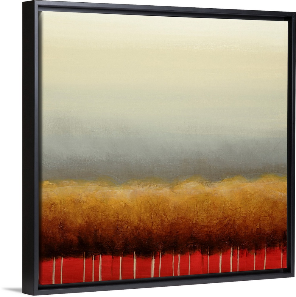<p>Square painting of a grove of golden trees with a red background and a wide gray sky above.</p>