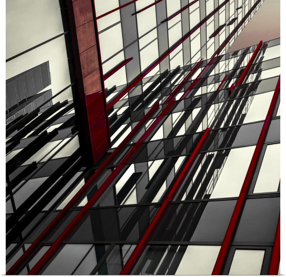 <p>Abstract photograph of intersecting red and black panels and windows in a building.</p>