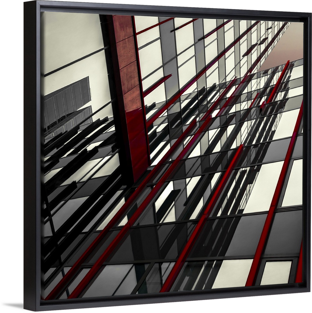 <p>Abstract photograph of intersecting red and black panels and windows in a building.</p>