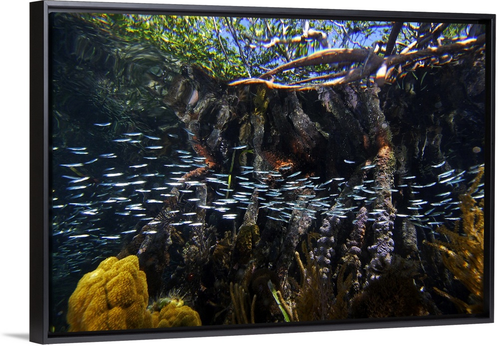 <p>Red Mangrove (Rhizophora mangle) aerial roots providing shelter for school of small fish, Carrie Bow Cay, Belize</p>