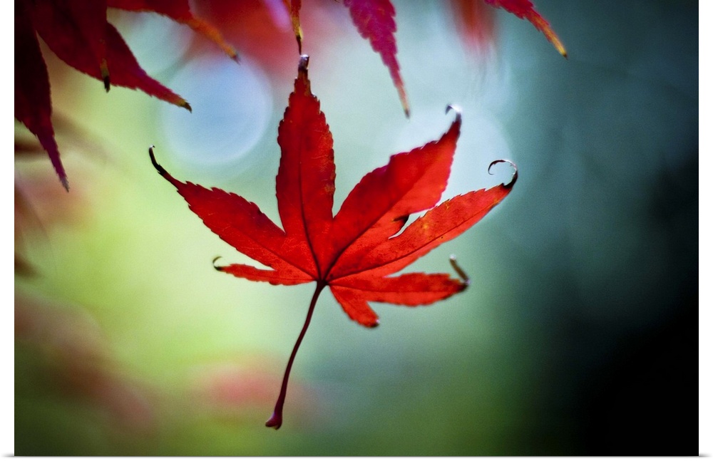 <p>A bright red Japanese maple leaf drops gently to the ground. A gentle autumn wind and a blue green background.</p>