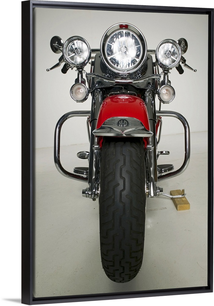 <p>Vertical photo on canvas of a vintage motorcycle seen from the front.</p>