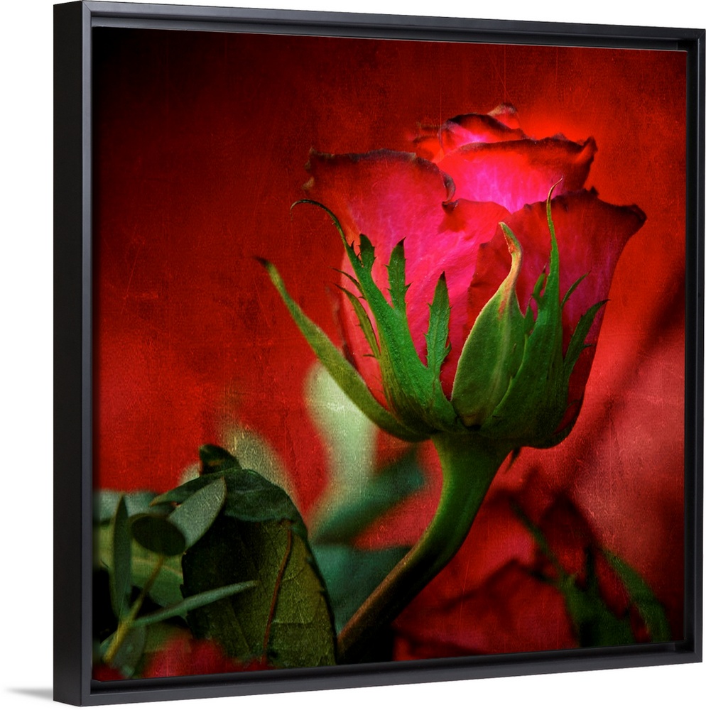 <p>Square, large fine art photograph of a red rose on a hazy red background, surrounded by leaves.</p>