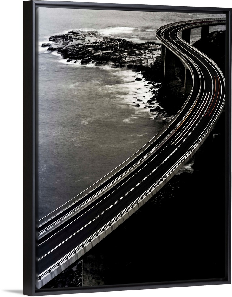 <p>Vertical long exposure photograph of a winding bridge over an ocean with red and orange lines from traveling cars.</p>