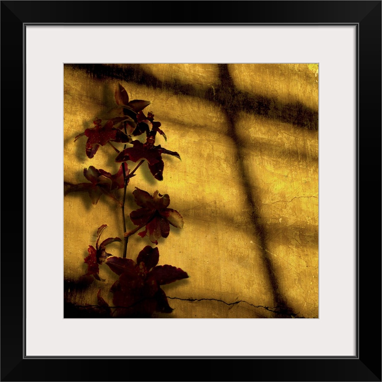 <p>A blood-red orchid against a cracked, golden stucco wall catches the setting sun.</p>