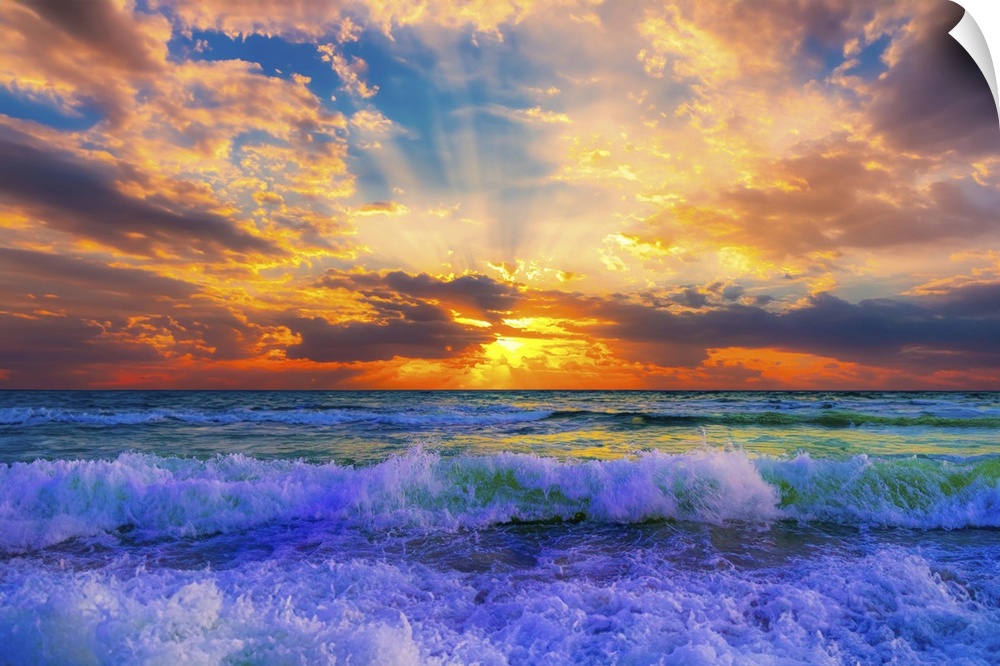 <p>A fruit punch sun kissed orange sunset with sunrays illuminate the soft pink clouds. Blue waves break the green sea.</p>