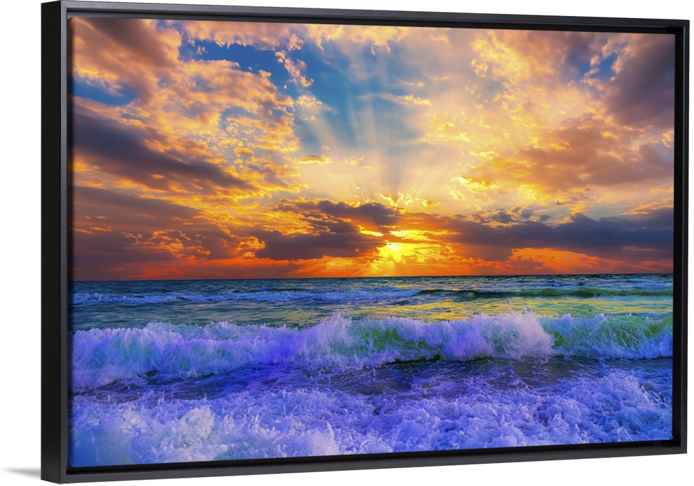 <p>A fruit punch sun kissed orange sunset with sunrays illuminate the soft pink clouds. Blue waves break the green sea.</p>