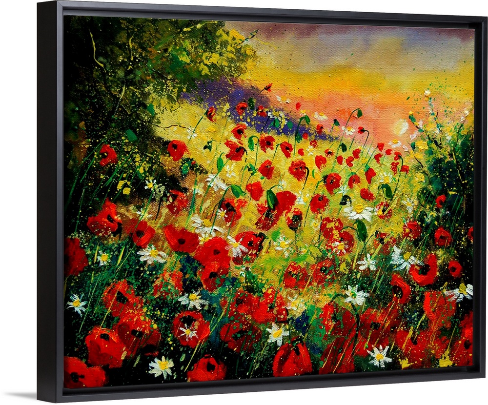 <p>Horizontal painting of a field of red poppies with splatters of multi-color paint overlapping the image.</p>