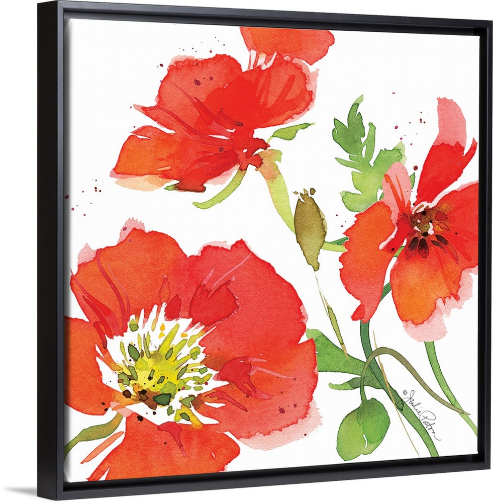 <p>Square watercolor painting of red poppies on a white background with a little bit of red paint splatter.</p>
