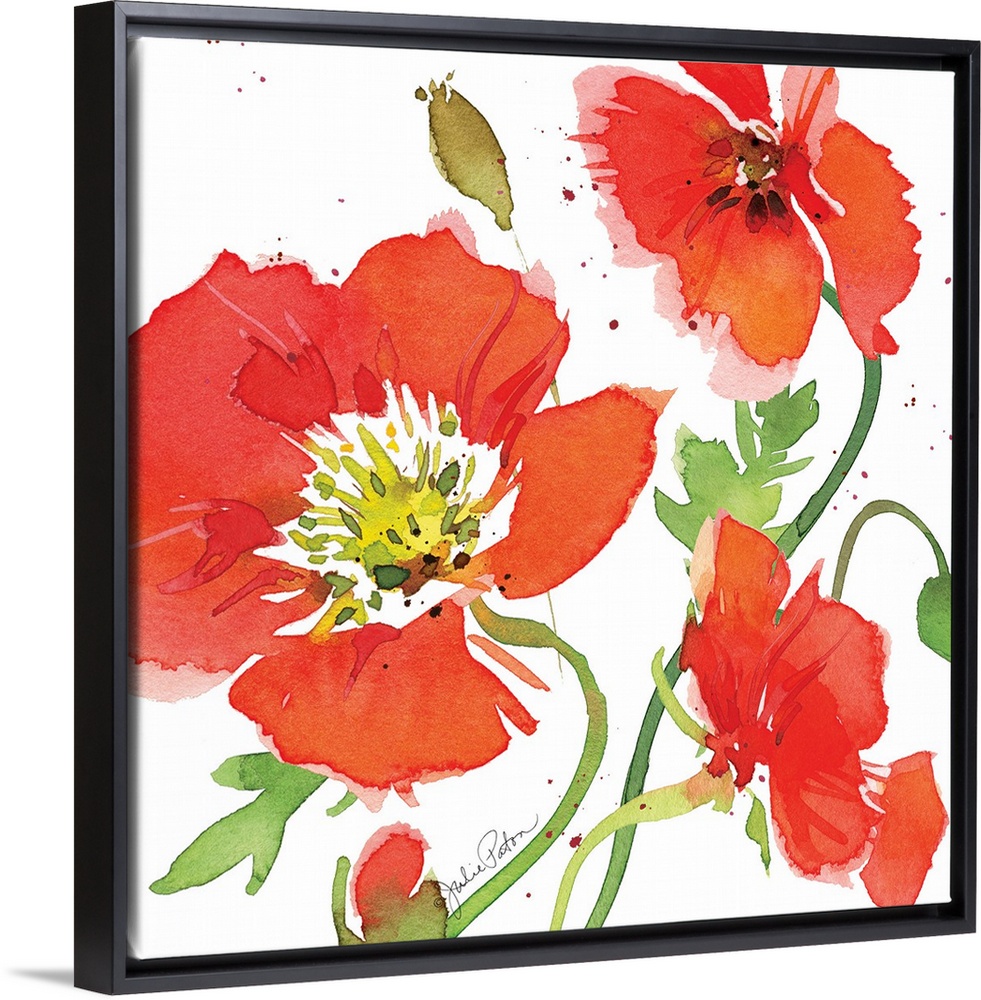 <p>Square watercolor painting of red poppies on a white background with a little bit of red paint splatter.</p>
