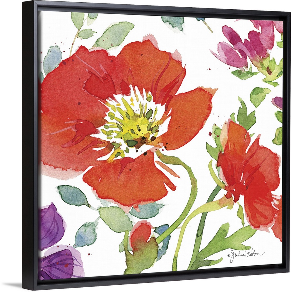 <p>Square watercolor painting of red poppies with a few purple and pink flowers on a white background.</p>