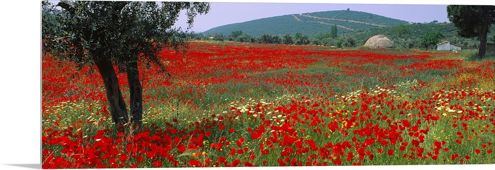 <p>A field amongst hills in an arid climate wildflowers bloom in the grass on this panoramic wall art for the home or office.</p>