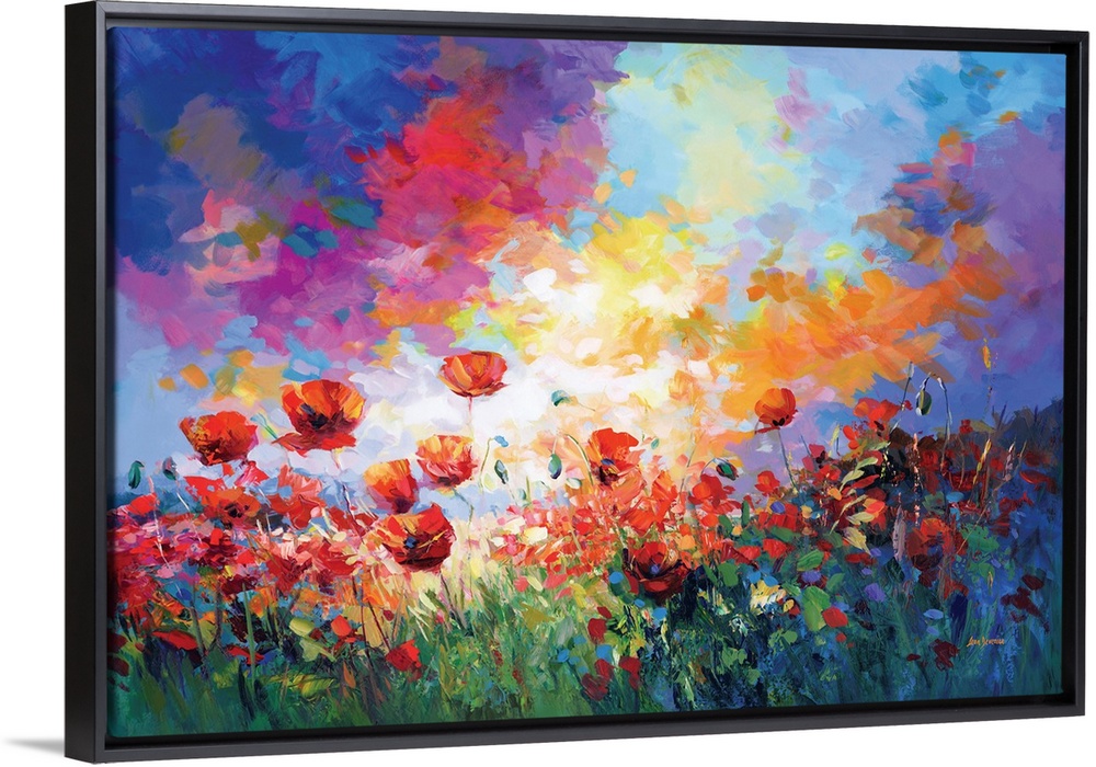 <p>Colorful artwork of a field of red poppy flowers illuminated by the warm colors of the sunset, creating a vibrant and serene atmosphere.</p>