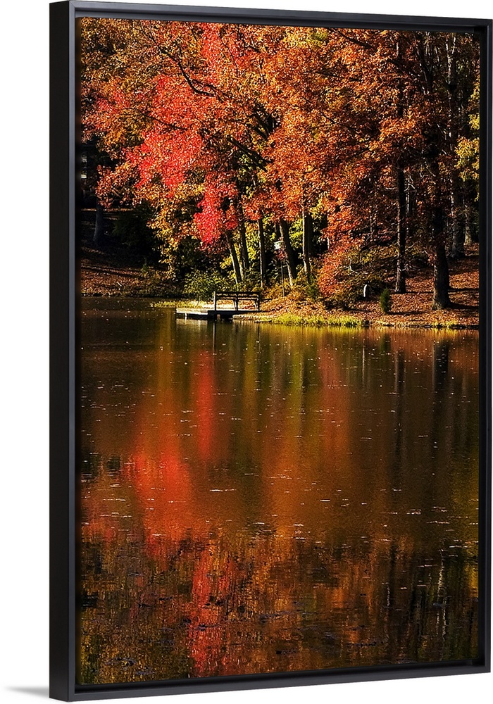 <p>Vertical photo on canvas of a lake with a dock and fall foliage surrounding it.</p>