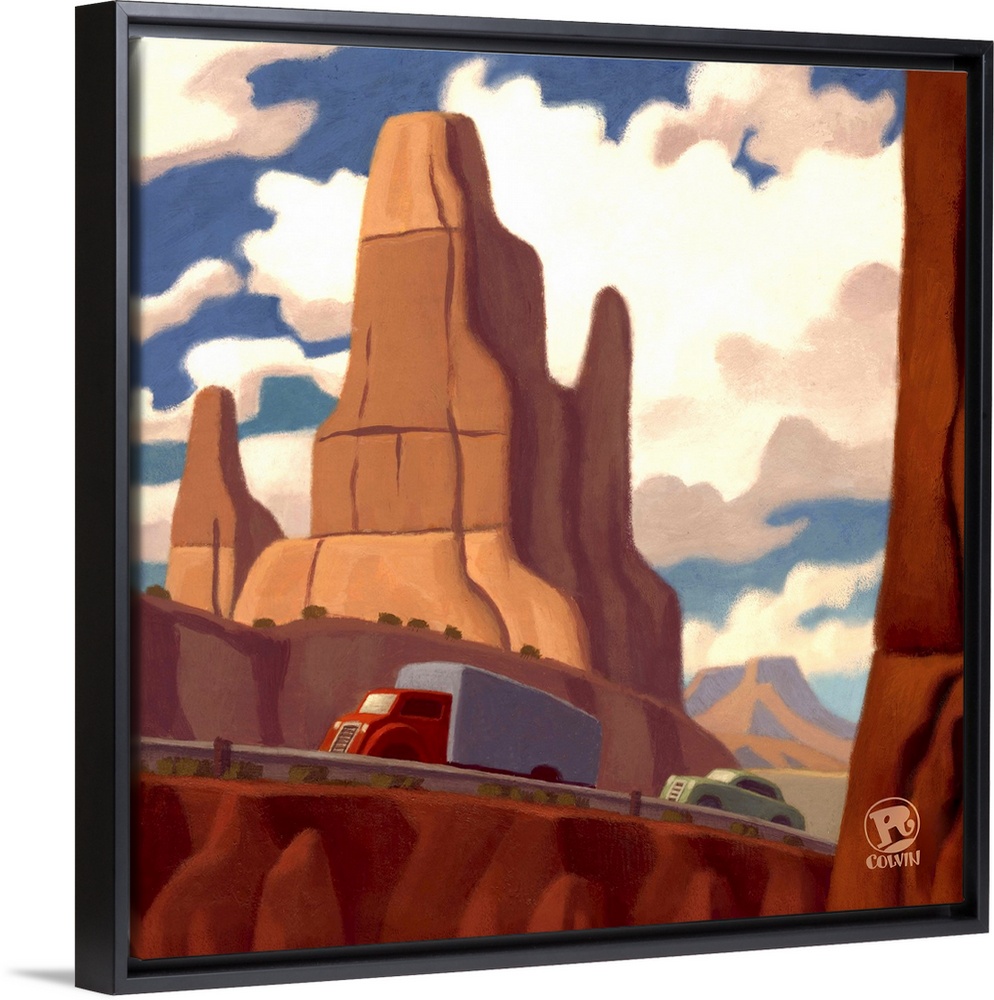 <p>Retro style landscape of a truck and car passing through the southwest desert on a scenic highway.</p>