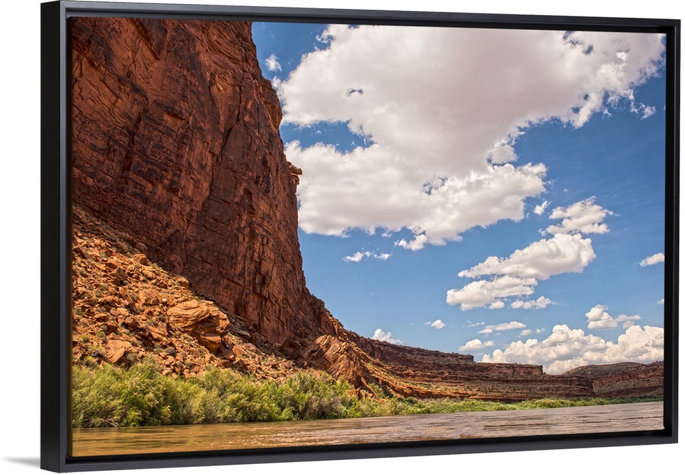 <p>Tall sandstone cliffs tower along the edge of the Colorado River, with clouds and blue skies overhead, Canyonlands National Park, Moab, Utah.</p>