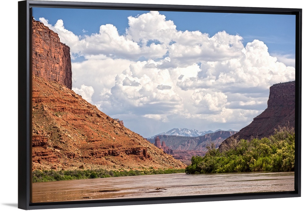 <p>Tall sandstone cliffs tower along the edge of the Colorado River, with clouds and blue skies overhead, Canyonlands National Park, Moab, Utah.</p>