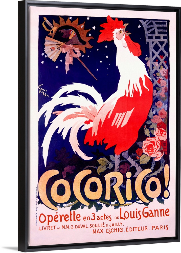 <p>1913 Romantic Opera When the Cock Crows. An enchanting design for this operetta of romance and misunderstanding whose loosely translated title means when the cock crows. A scarlet cock heralding the suns arrival in the navy night sky represents the action; a pink-ribboned fan, sword, and cockaded military hat are included to represent the lovers. As with most opera and operetta posters of this period, it was produced by the publisher to advertise the libretto rather than any actual performance. Louis Ganne (1862-1923) was a pupil of Ceasar Franck who went on to specialize in operettas. He is possibly best known in France as the composer of the patriotic song Marche Lorraine.</p>