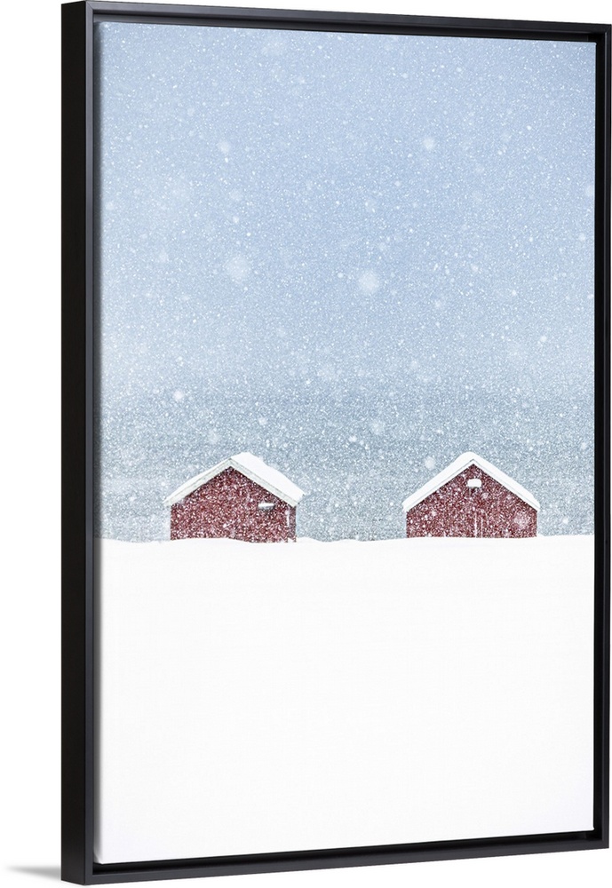 <p>Red rorbu cabins hit by a heavy snowfall in winter, Troms county, Norway</p>