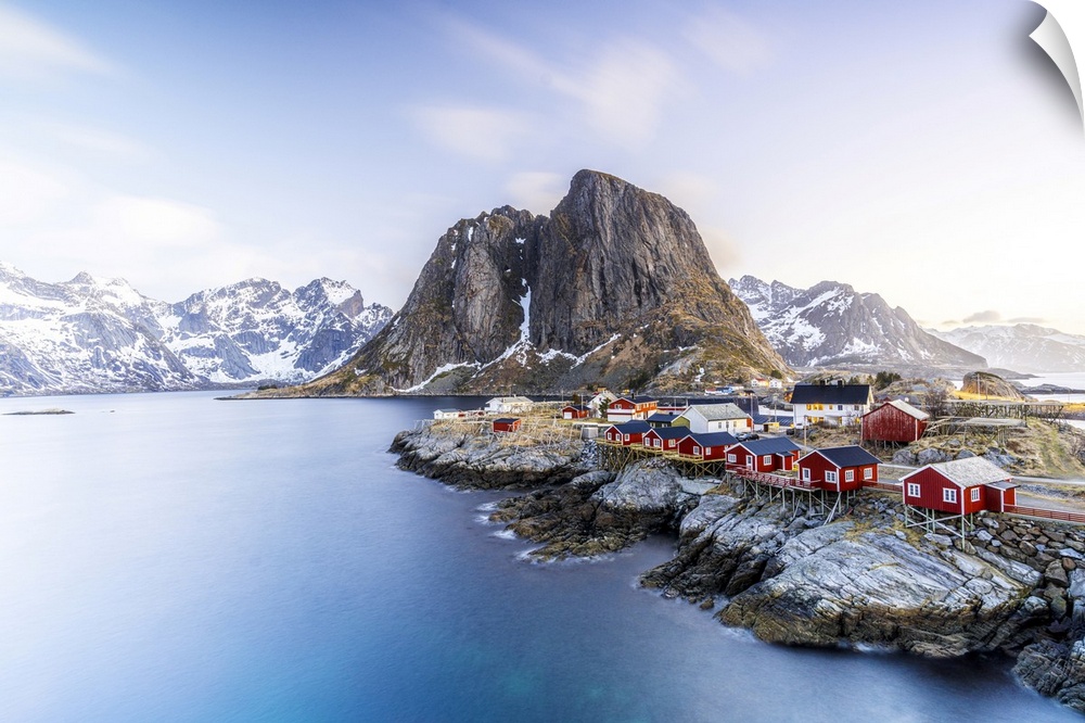 <p>High angle view of traditional red Rorbu cabins in the fishing village of Hamnoy at dawn, Reine, Lofoten Islands, Norway, Europe</p>