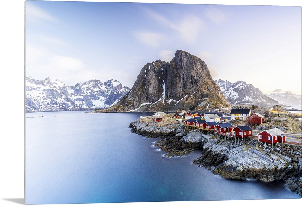 <p>High angle view of traditional red Rorbu cabins in the fishing village of Hamnoy at dawn, Reine, Lofoten Islands, Norway, Europe</p>
