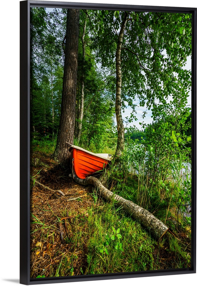 <p>Red row boat in the forest, hogland island, finland.</p>