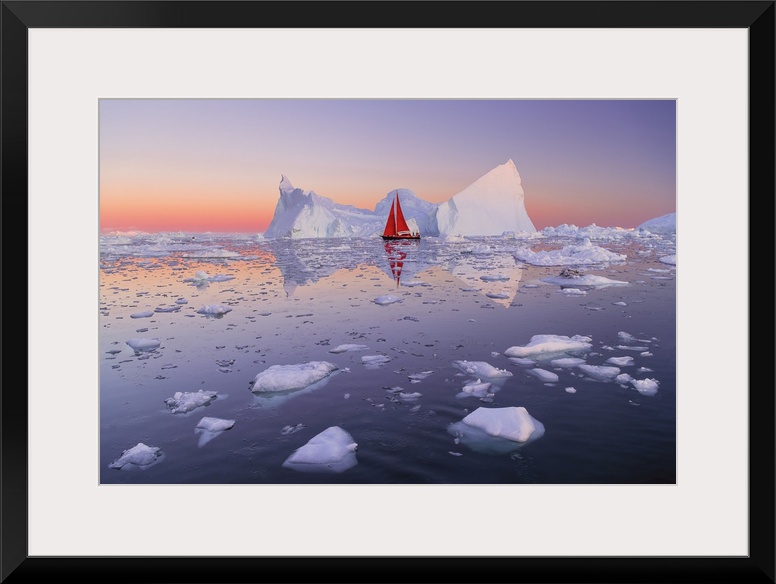 <p>Red sailboat at dusk near icebergs in Disko Bay, Greenland.</p>