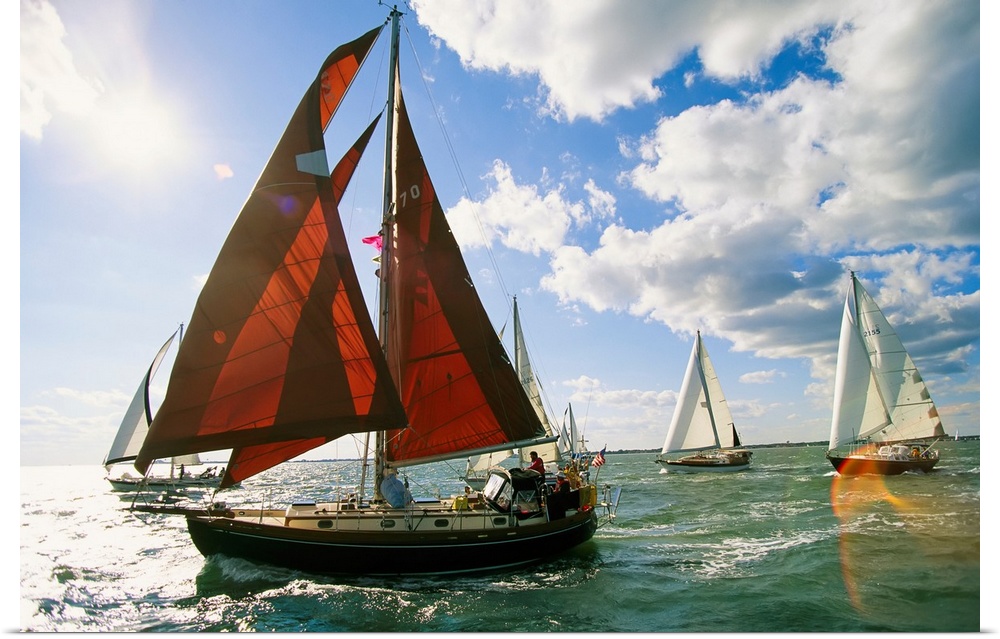 <p>Red-sailed sailboat and others in a race on the Chesapeake Bay.</p>