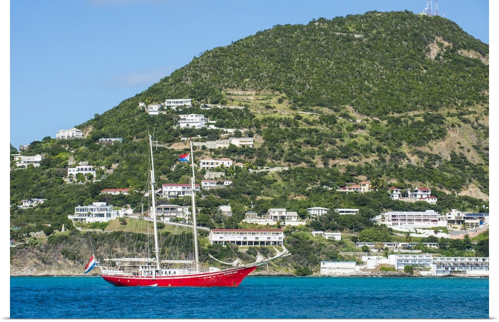 <p>Red sailing boat in the bay of Philipsburg, Sint Maarten, West Indies, Caribbean</p>