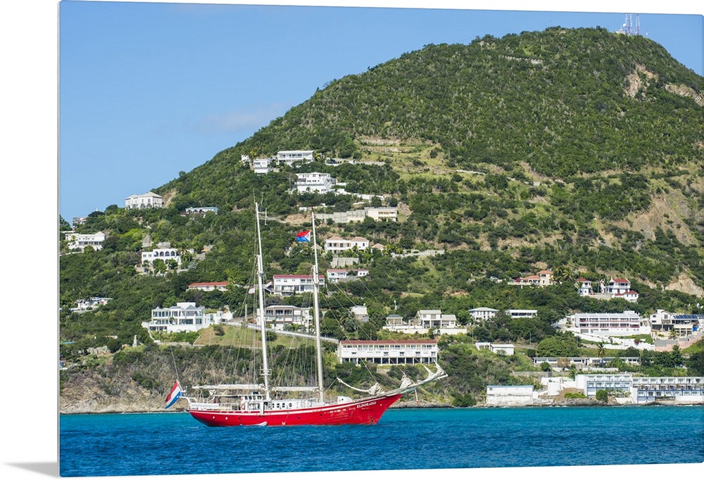 <p>Red sailing boat in the bay of Philipsburg, Sint Maarten, West Indies, Caribbean</p>