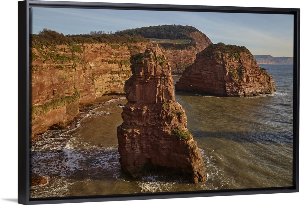 <p>Red sandstone cliffs and rocks at Ladram Bay, in the Jurassic Coast UNESCO World Heritage Site, near Budleigh Salterton, East Devon, England, United Kingdom, Europe</p>