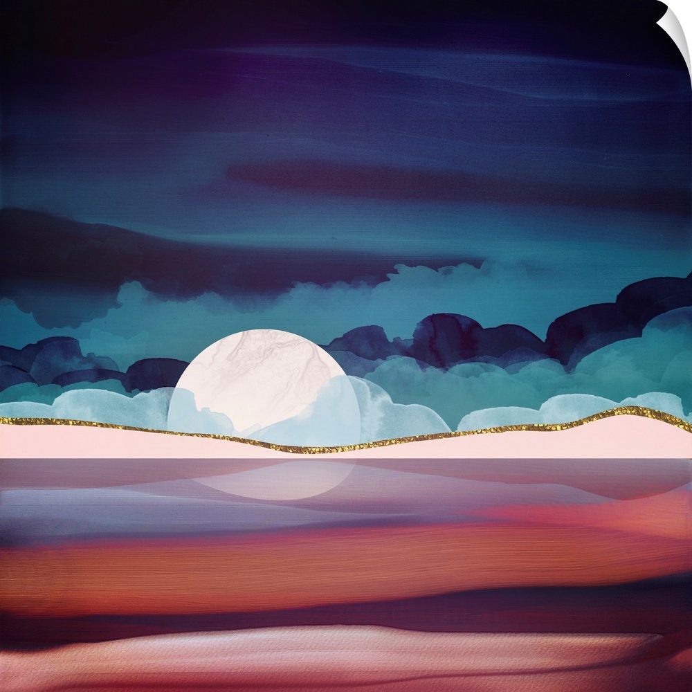 <p>Abstract depiction of a red sea with clouds, pink, maroon, gold and blue.</p>