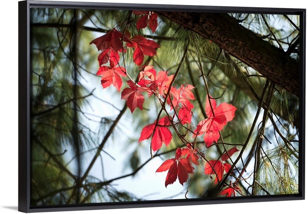 <p>Fine art photo of vivid fall leaves standing out against dark branches and pine needles.</p>