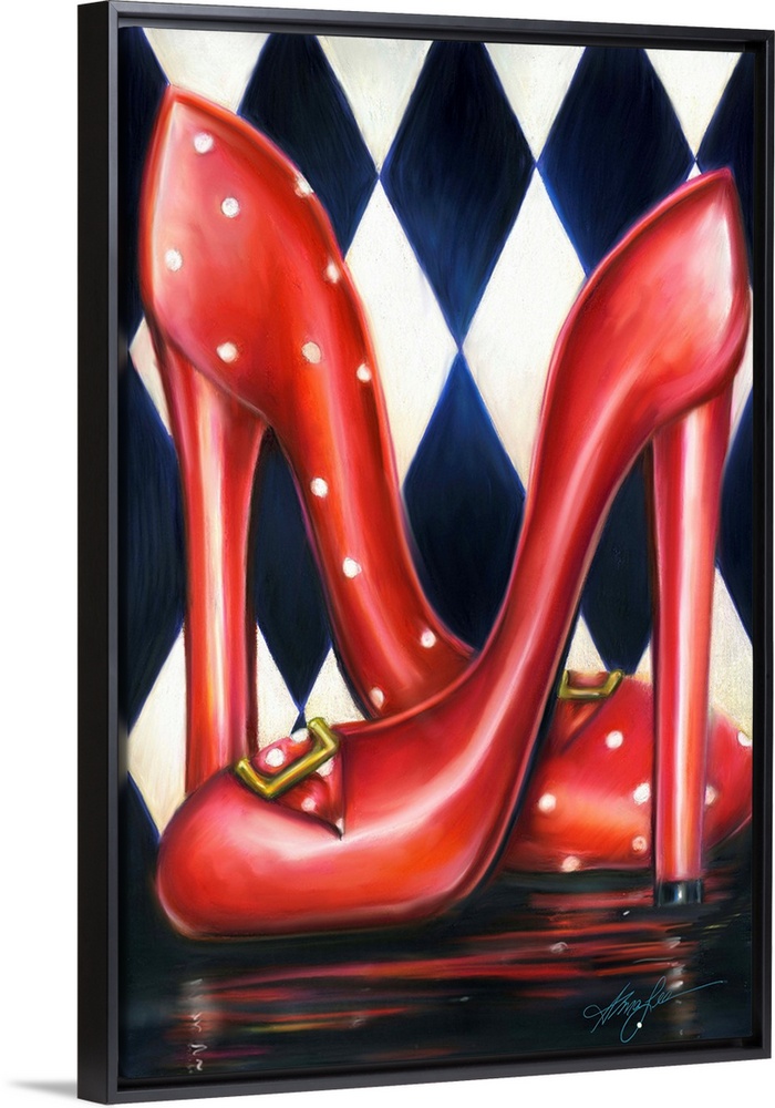 <p>A vertical contemporary painting of a pair of red heels against a diamond checkered background.</p>