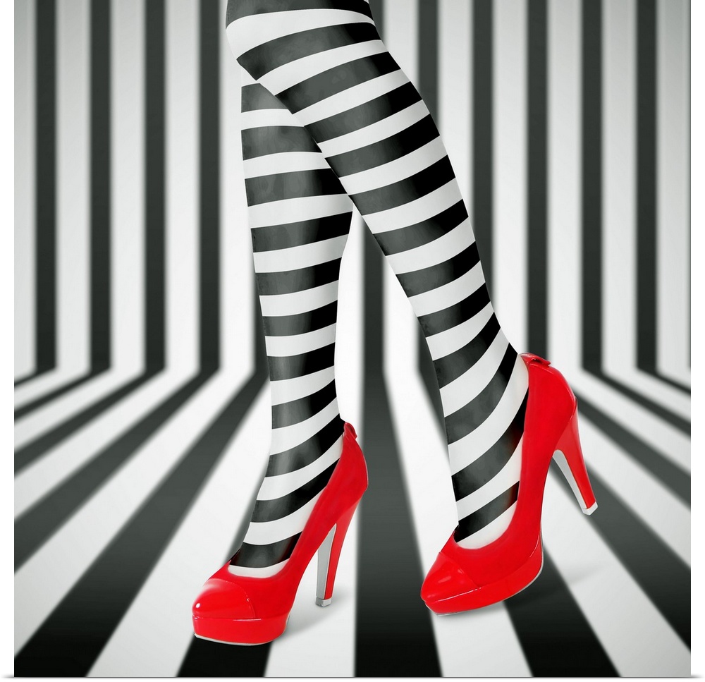 <p>Woman's legs wearing black and white striped leggings and bright red high heels, against a matching striped background.</p>