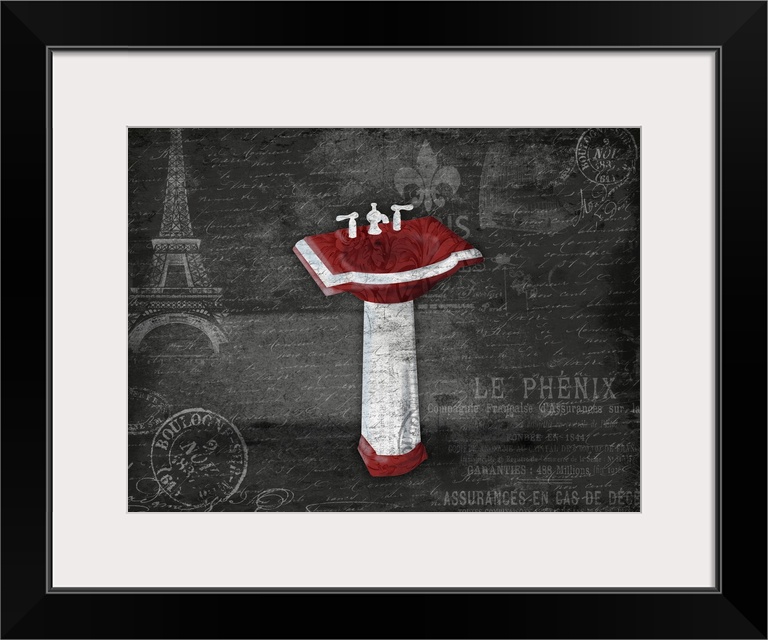 <p>Red sink against a postage style background with Eiffel Tower.</p>