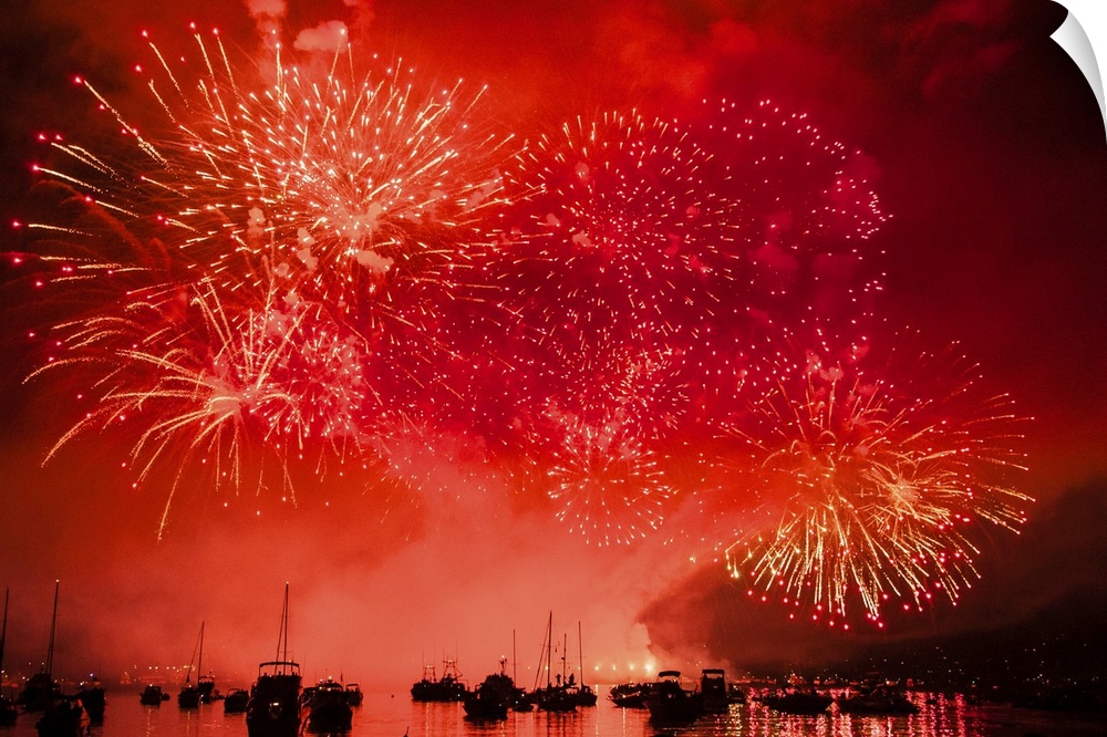 <p>Fireworks and boats in the ocean against a red sky</p>