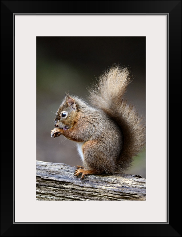 <p>Red squirrel grooming. Eurasian red squirrel (Sciurus vulgaris) on a tree, using its tongue to lick and groom the fur on its forearms. This animal is an omnivorous rodent that is found in woodlands across Eurasia. The red squirrel's coat varies in colour according to location and time of year. Photographed in February on Brownsea Island, Dorset, UK.</p>