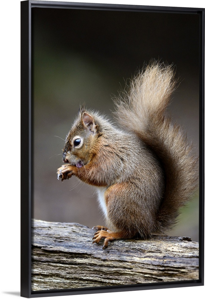 <p>Red squirrel grooming. Eurasian red squirrel (Sciurus vulgaris) on a tree, using its tongue to lick and groom the fur on its forearms. This animal is an omnivorous rodent that is found in woodlands across Eurasia. The red squirrel's coat varies in colour according to location and time of year. Photographed in February on Brownsea Island, Dorset, UK.</p>