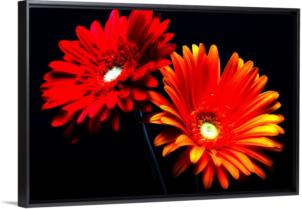 <p>This horizontal photograph shows two gerbera daisies under a spotlight against a dark backdrop.</p>