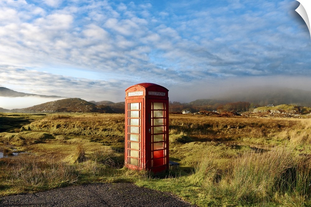 <p>Autumn view of a red telephone box at the side of a quiet road in the remote misty Ardnamurchan moors of the Scottish Highlands, Scotland</p>