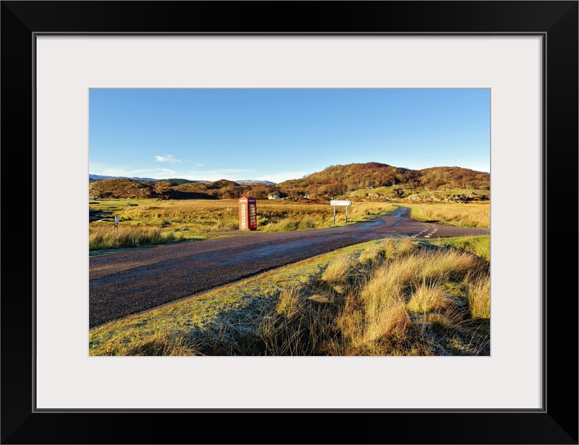 <p>An autumn view of a red telephone box at the side of a quiet road in the remote Ardnamurchan moors of the Scottish Highlands, Scotland</p>