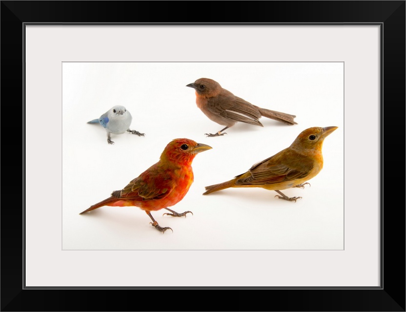 <p>Habia fuscicauda, Thraupis episcopus, Piranga flava, blue-grey tanager. Baru, Colombia.</p>