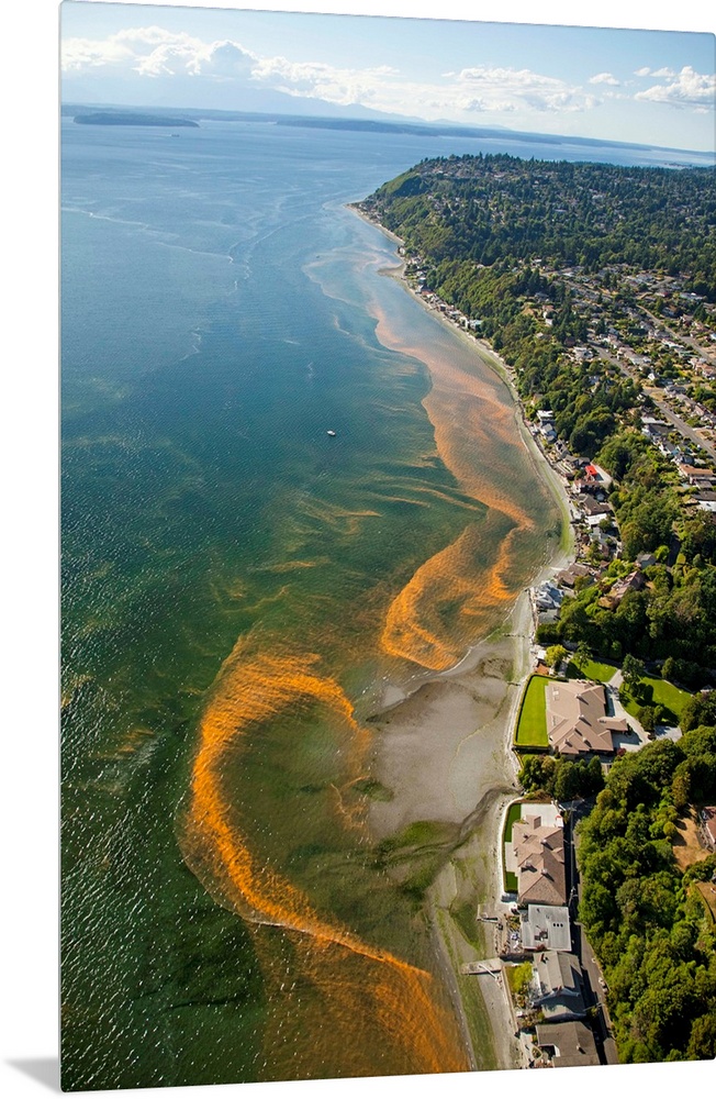 <p>aerial photo of red tide blooms along the Puget Sound shoreline in the Normandy Park area south of Seattle</p>