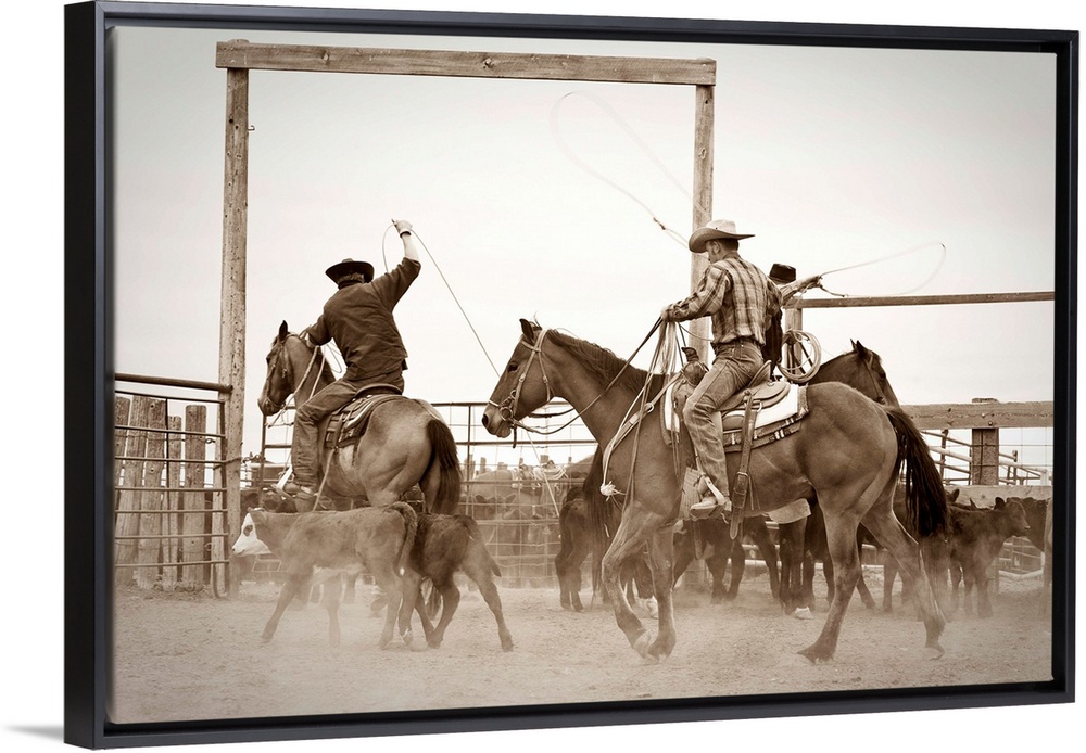 <p>Cowboys on horseback roping steer in corral</p>
