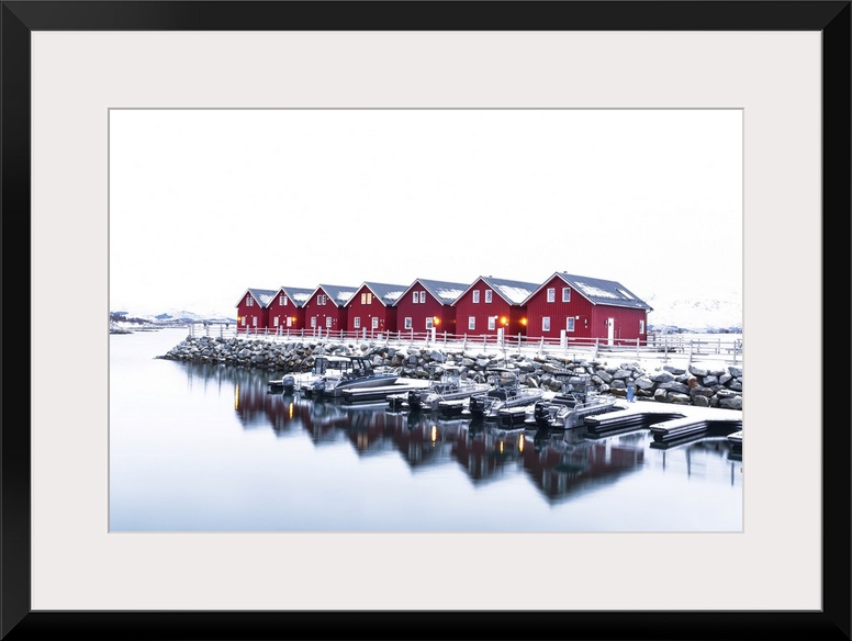 <p>Row of red traditional wooden cabins standing above a small harbour in the snowy landscape, Leknes, Lofoten Islands, Norway, Scandinavia, Europe</p>