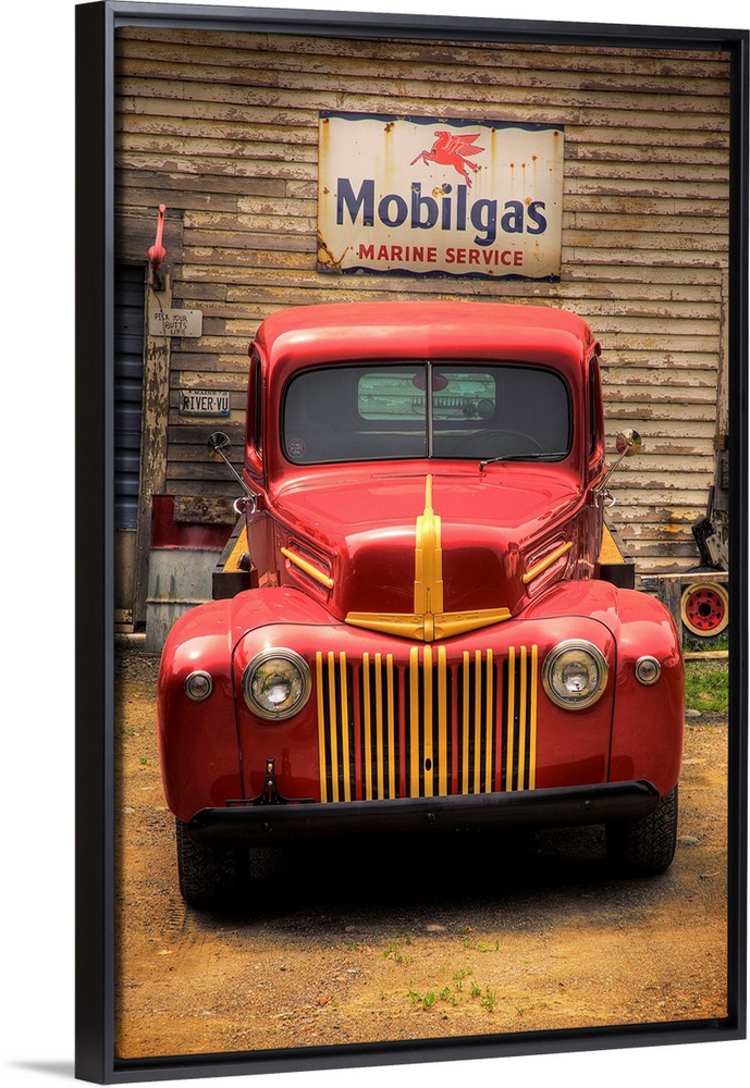 <p>Classic old red truck parked in front of a Mobilgas sign.</p>