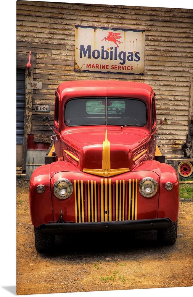 <p>Classic old red truck parked in front of a Mobilgas sign.</p>